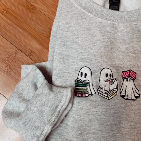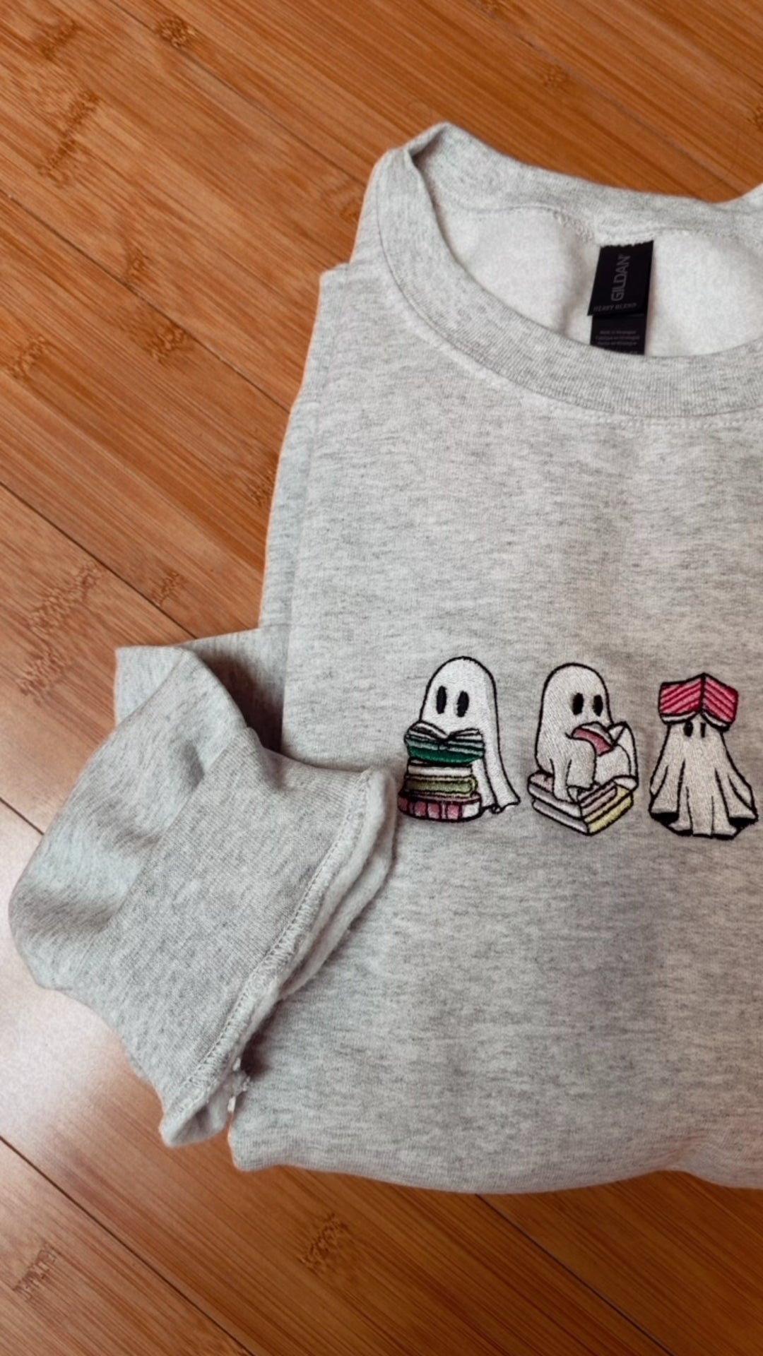 Embroidered Gildan crew, pictured is the ash crew- "book ghost " design, embroidered design