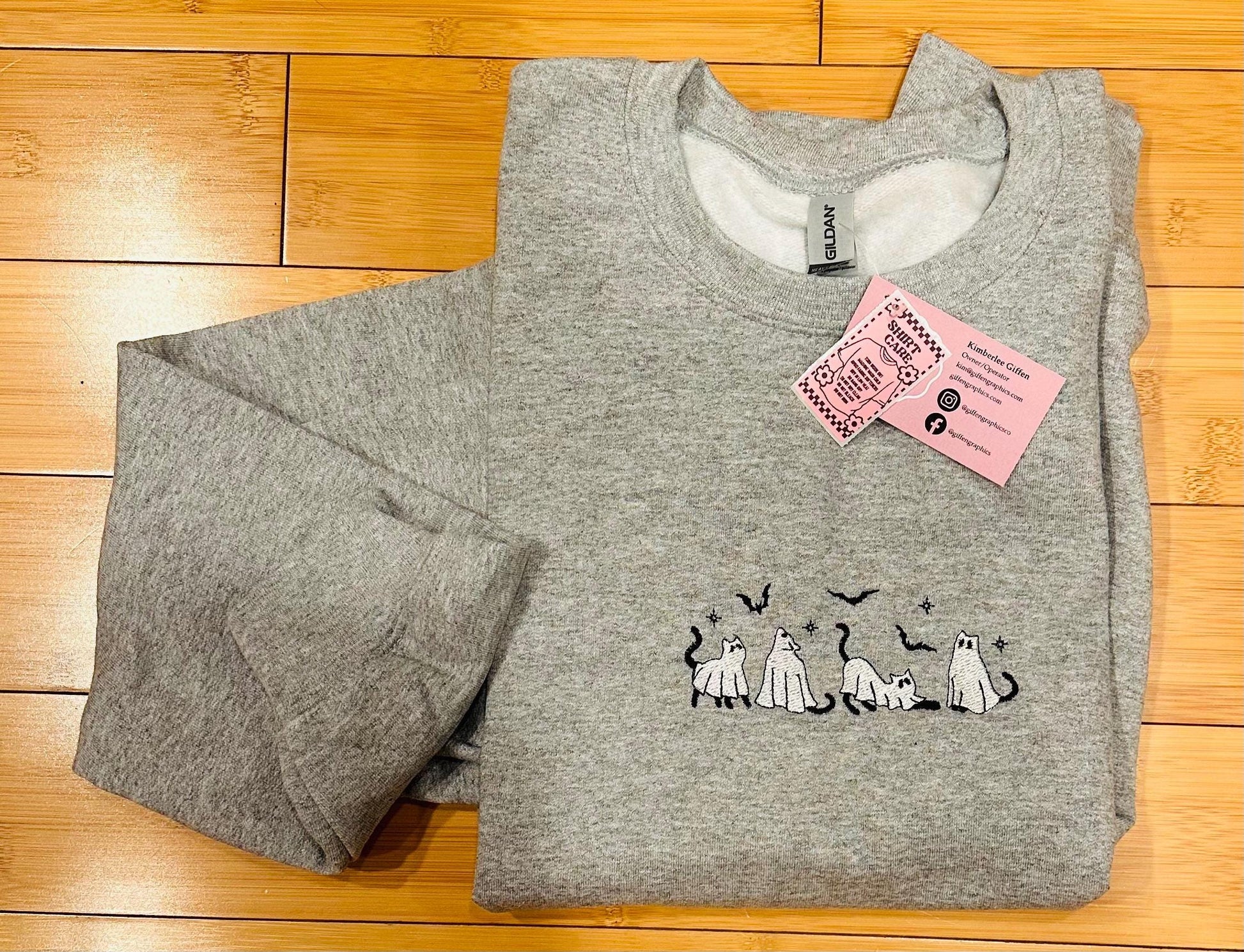 Embroidered gildan crew, pictured is sport grey - ghost cat design, embroidered design, fall tee